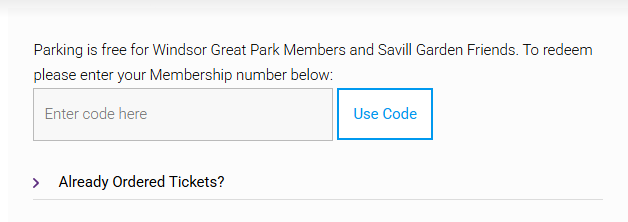 To redeem your free parking, click this link and have your membership number ready to enter in the box: https://tickets.windsorilluminated.com/timeslots/filter/windsor-great-park-illuminated